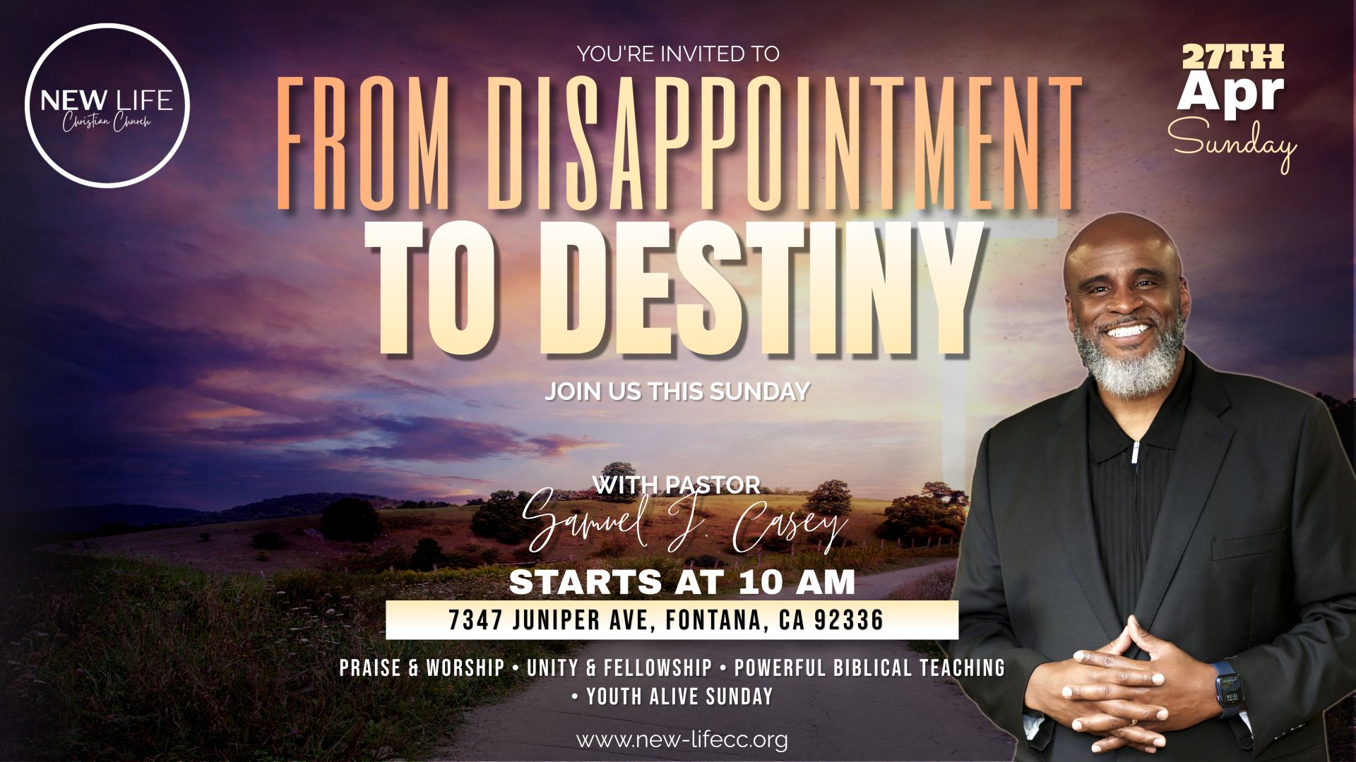 Pastors Samuel J. Casey and Tamika R. Casey are the founding pastors of New Life Christian Church in Fontana, California. The Lord led them to launch this dynamic ministry in October of 2013. Pastor Samuel J. Casey began his ministry in 1993 at Mt. Olive 2nd M.B.C. under the leadership of Pastor E. Winford Bell. Pastor Samuel preached his first sermon on Sunday, November 7, 1993; his first sermon was emblematic of a battle of his life, "You Can Run, But You Can't Hide," from the book of Jonah. He and Tamika were both active members under the covering of Pastor E. Winford Bell. Pastor Samuel J. Casey was licensed at Mt. Olive 2nd M.B.C. in 1994 and ordained in 2002.