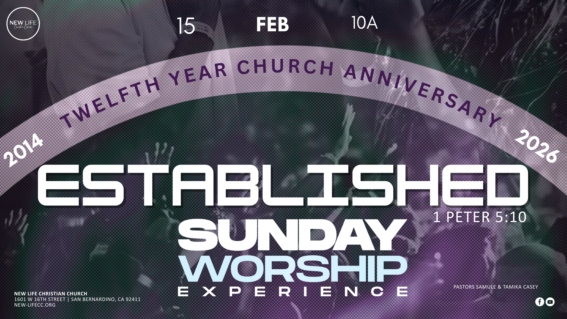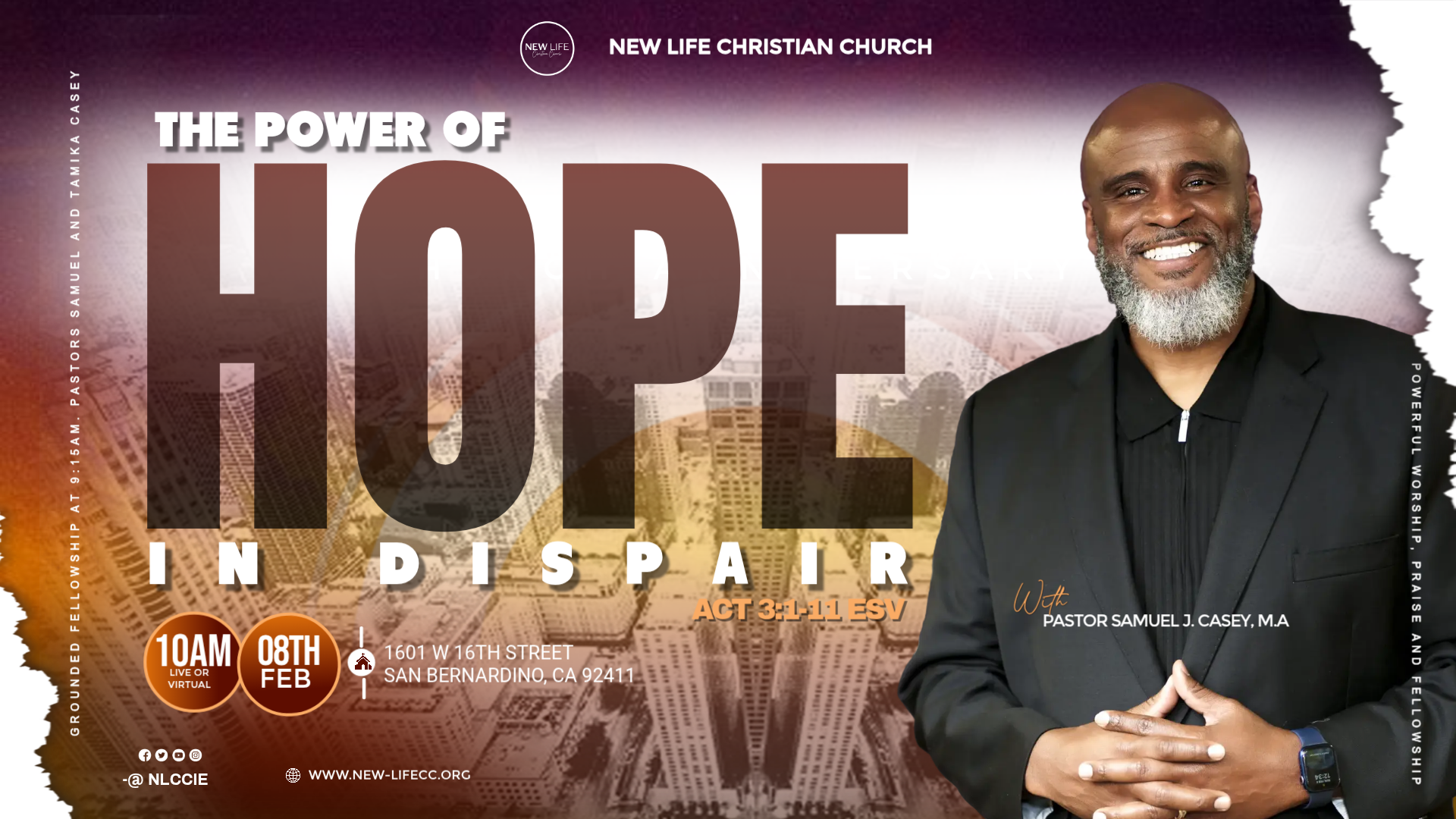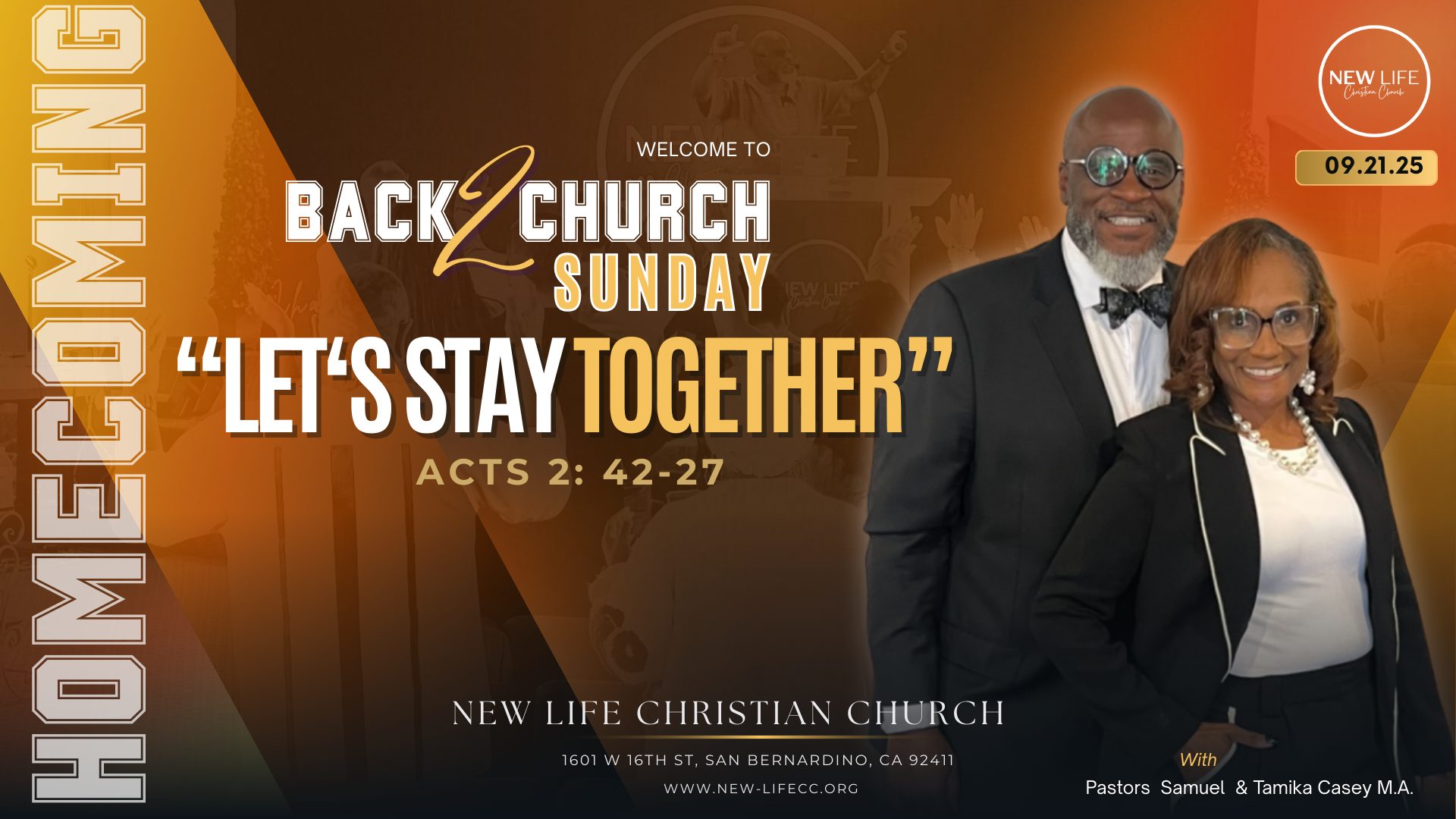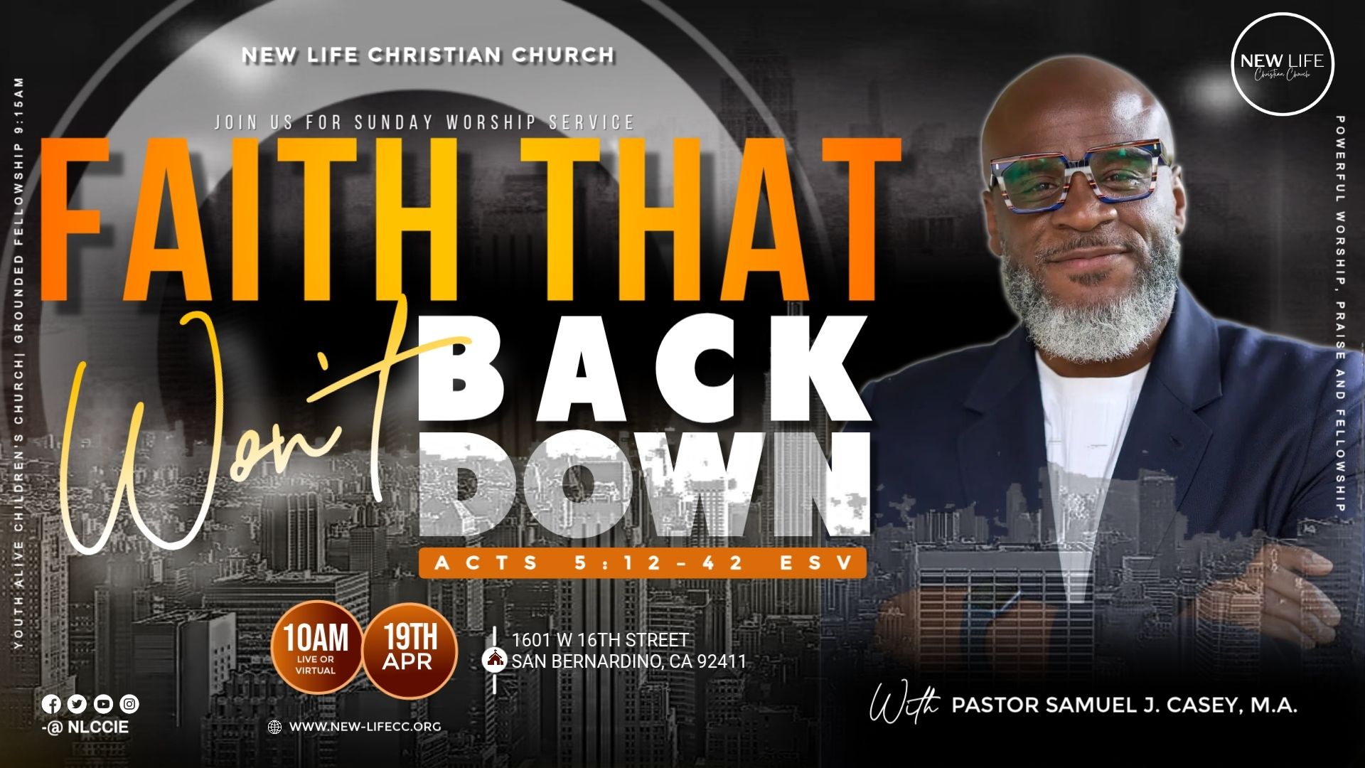 Pastors Samuel J. Casey and Tamika R. Casey are the founding pastors of New Life Christian Church in Fontana, California. The Lord led them to launch this dynamic ministry in October of 2013. Pastor Samuel J. Casey began his ministry in 1993 at Mt. Olive 2nd M.B.C. under the leadership of Pastor E. Winford Bell. Pastor Samuel preached his first sermon on Sunday, November 7, 1993; his first sermon was emblematic of a battle of his life, "You Can Run, But You Can't Hide," from the book of Jonah. He and Tamika were both active members under the covering of Pastor E. Winford Bell. Pastor Samuel J. Casey was licensed at Mt. Olive 2nd M.B.C. in 1994 and ordained in 2002.
